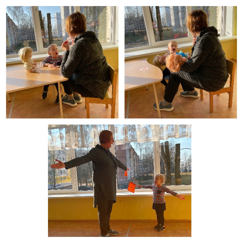 Учитель-дефектолог проводит коррекционные занятия с неслышащими детьми 1 года обучения в игровой форме. Занятия направлены на развитие слухового восприятия и формирование произношения. Работа над произношением ведется на основе аналитико-синтетического метода: у детей формируется умение произносить целые слова и отдельные элементы (звуки, слоги). В ходе игр и упражнений у воспитанников с нарушением слуха развивается умение подражать звучащей речи. С целью формирования длительного плавного звучания звуков, развития голоса проводятся игры и упражнения: «Укачивание куклы» (кукла спит), плавное размахивание флажком с произношением звука [А]. Учитель-дефектолог вместе с воспитанником выполняют плавные, длительные, мягкие движения и произносят звук [А], изменяя силу голоса.