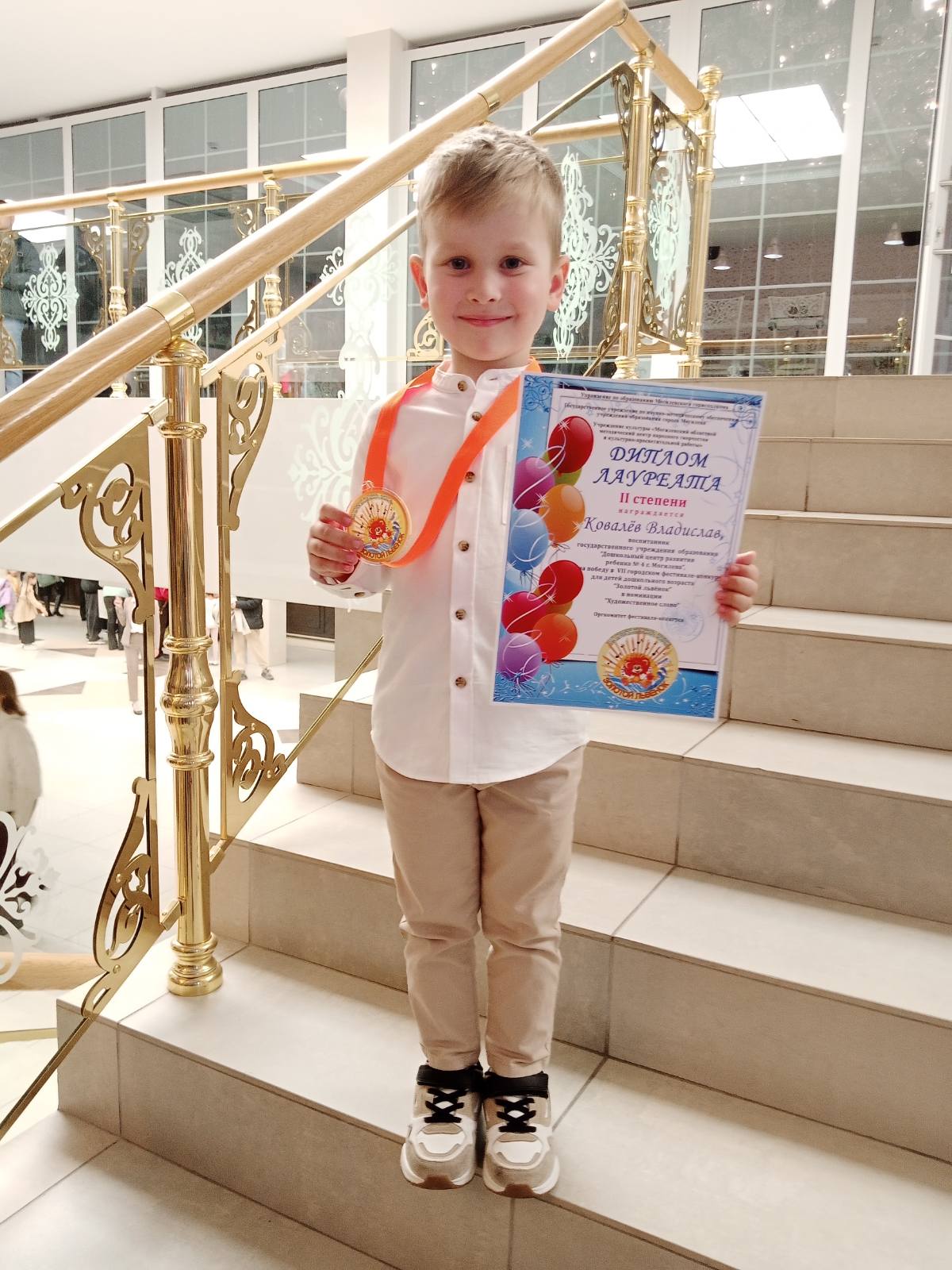 Воспитанник нашего учреждения дошкольного образования, Ковалёв Владислав, с гордостью получил диплом лауреата II степени на VII городском фестивале-конкурсе для детей дошкольного возраста «Золотой львенок»!